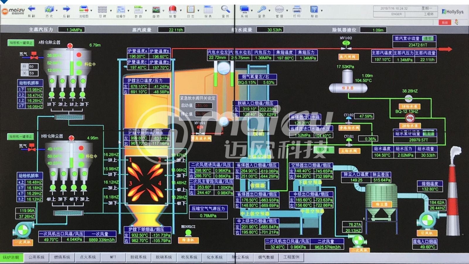 系統(tǒng)簡介 工業(yè)煤粉鍋爐系統(tǒng)包含十三個集成設(shè)備單元(站),即:煤粉儲供單元、燃燒器單元、鍋爐本體單元、脫硝單元(SNCR和SCR)、除塵單元、脫硫單元、熱力單元、點火油氣站、惰性氣體保護站、壓縮空氣站、飛灰收集及儲存單元和測控單元。系統(tǒng)采用以下工藝流程:由煤粉制備單元制成的合格煤粉經(jīng)氣力輸送送至煤粉塔。塔內(nèi)煤粉按需進入中間計量倉后由供料器及風粉混合管道送入煤粉燃燒器,燃燒器和鍋爐爐膛構(gòu)成燃燒系統(tǒng)以供給熱水。燃燒換熱后的煙氣經(jīng)過布置在鍋爐尾部的脫硝單元后進入布袋除塵器。除塵器排出的潔凈煙氣經(jīng)引風機送入脫硫單元,然后符合國家環(huán)保規(guī)定的潔凈煙氣經(jīng)煙囪排入大氣。布袋收集的飛灰密閉排出,集中處理。鍋爐系統(tǒng)的運行由點火程序控制器和上位計算機監(jiān)控系統(tǒng)共同完成。 系統(tǒng)功能 轉(zhuǎn)化,循環(huán)經(jīng)濟:鍋爐系統(tǒng)完成了由傳統(tǒng)的人工操作向智能操作的轉(zhuǎn)化,以及從工業(yè)廢料到工業(yè)原料的轉(zhuǎn)化。系統(tǒng)可實現(xiàn)即開即停,30秒切斷點火源進入穩(wěn)定運行狀態(tài),切斷煤粉供給即可瞬時實現(xiàn)停爐;全自動監(jiān)控、調(diào)整運行參數(shù),使系統(tǒng)處于最佳運行工況;同時降低了勞動強度以及人為因素對鍋爐運行的干擾; 不見,環(huán)境友好:即不見煤、不見煙、不見灰。鍋爐成功實現(xiàn)了全系統(tǒng)密閉運行,自動上煤、集中排灰,無粉塵跑冒。煤粉燃燒器采用了低溫空氣分級燃燒設(shè)計,爐膛溫度場均勻,避免局部高溫,降低 NOx生成;煙氣采用布袋除塵,排放濃度低。經(jīng)除塵器收集的粉煤灰經(jīng)密閉系統(tǒng)輸入灰塔,可集中處理和利用、變廢為寶,無二次污染; 節(jié)約,節(jié)能降耗:經(jīng)實踐證明,煤粉鍋爐系統(tǒng)節(jié)煤、節(jié)地、節(jié)人、節(jié)電效果顯著。系統(tǒng)煤粉燃燒充分、專用煤粉鍋爐運行效率高,比傳統(tǒng)燃煤鍋爐節(jié)煤 30%-50% 。無堆煤場與渣場,占地面積小。對較大功率設(shè)備采用變頻器控制,節(jié)電效果明顯。鍋爐操作簡單,測控水平高,大大降低了人工成本,節(jié)省了勞動力。 -------------------------------------------------------------------------------------------------------------------------------------------------------- 1臺60T燃煤粉蒸汽鍋爐和輔機系統(tǒng)等電控系統(tǒng) 中節(jié)能萬潤股份有限公司(以下簡稱“萬潤股份”)主要從事信息材料產(chǎn)業(yè)、環(huán)保產(chǎn)業(yè)和大健康產(chǎn)業(yè)產(chǎn)品的研發(fā)、生產(chǎn)和銷售,是國家級企業(yè)技術(shù)中心和國家級高新技術(shù)企業(yè)。 控制方式 本項目采用和利時HOLLiAS MACS-K大型分布式控制系統(tǒng)。系統(tǒng)網(wǎng)絡(luò)、控制網(wǎng)絡(luò)、控制器、電源模塊均為冗余配置。集控室設(shè)置工程站、歷史站、操作員站。對整個鍋爐系統(tǒng)、給粉系統(tǒng)、點火系統(tǒng)、燃燒系統(tǒng)、脫硫脫硝系統(tǒng)實現(xiàn)數(shù)據(jù)監(jiān)視,故障查詢,設(shè)備控制及數(shù)據(jù)分析。化水系統(tǒng)、吹灰系統(tǒng)、除塵系統(tǒng)及煙氣檢測系統(tǒng)自帶控制器,我方系統(tǒng)采用K-MOD01模塊,通過標準Modbus RTU通訊協(xié)議對各設(shè)備進行通訊。對于給水三沖量控制,給粉風機、一次風機、二次風機頻率控制等復(fù)雜回路的控制,我公司自控人員根據(jù)系統(tǒng)的特性,結(jié)合自己多年現(xiàn)場經(jīng)驗,把PID算法和實際操作經(jīng)驗值相結(jié)合,采用模糊自適應(yīng)PID算法,被控對象能夠長時間穩(wěn)定運行,從而保證了整個系統(tǒng)的穩(wěn)定運行。本系統(tǒng)還開放了OPC接口,用于接入全廠MES系統(tǒng),實現(xiàn)了數(shù)據(jù)的高級管理和共享,便于用戶對鍋爐系統(tǒng)的整體管理。